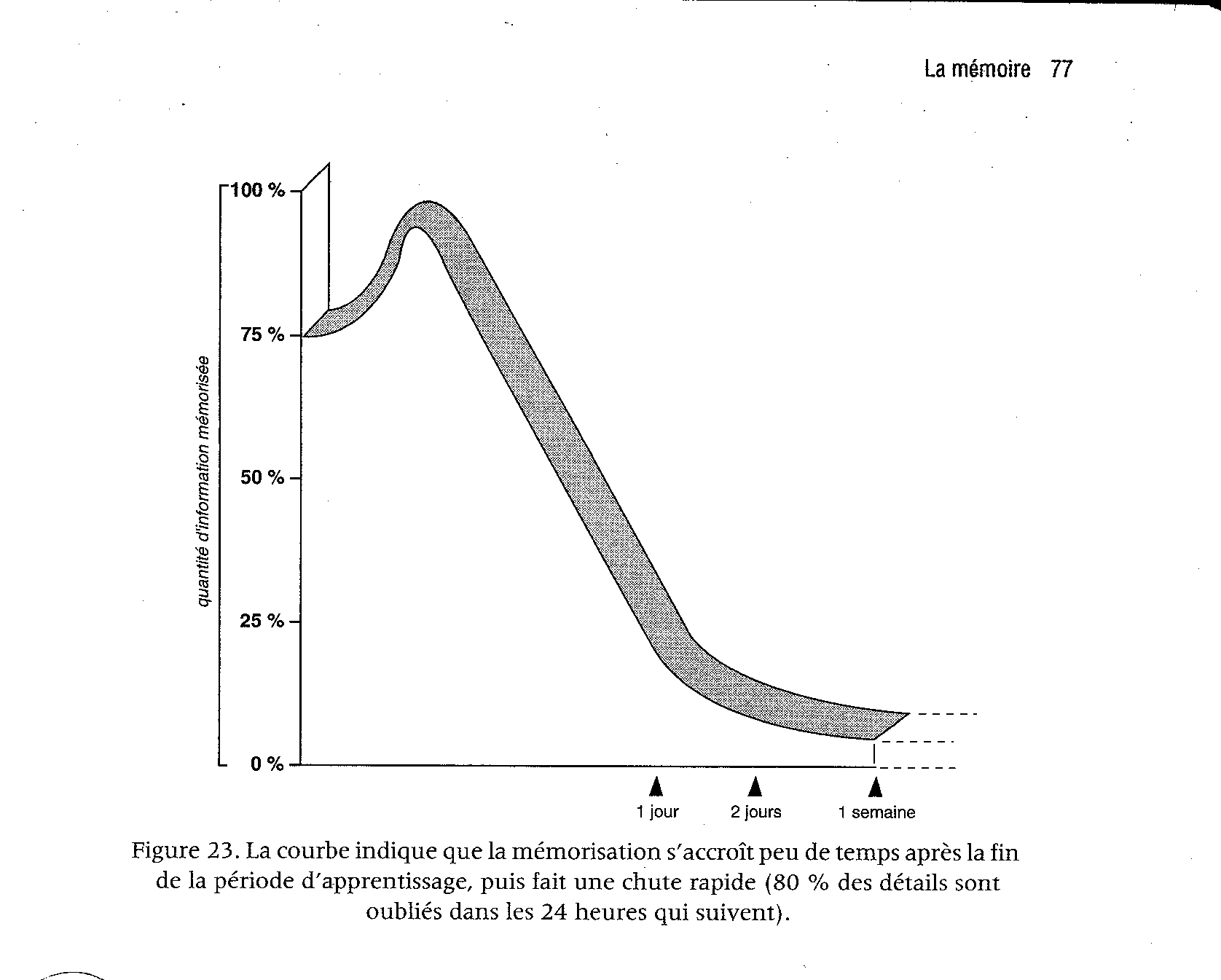Ce graphique précise la déperdition des éléments enregistrés par un individu au fil du temps. Il nous indique de manière spectaculaire que la déperdition de mémoire est très rapide d’un jour à l’autre : perte de 80% des détails dans les 24 heures.