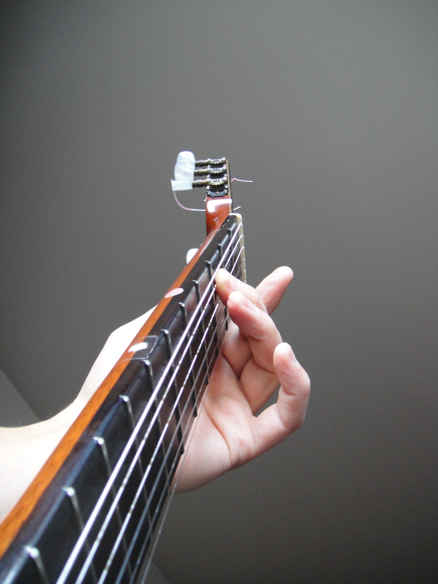 C’est le cas de la position que devrait adopter la main gauche. Dans la grande tradition académique, les doigts devraient se positionner de manière perpendiculaire au manche, se posant sur la touche à la manière de petits marteaux. Si dans des cas particuliers ce fonctionnement est le meilleur voire l’unique, lors du jeu en tierces par exemple, il ne devrait pas être systématique.