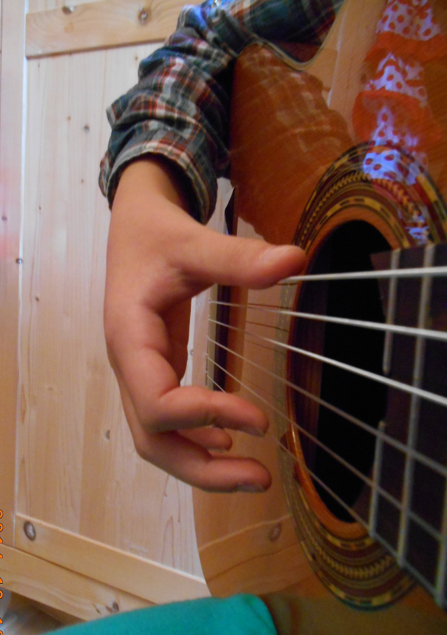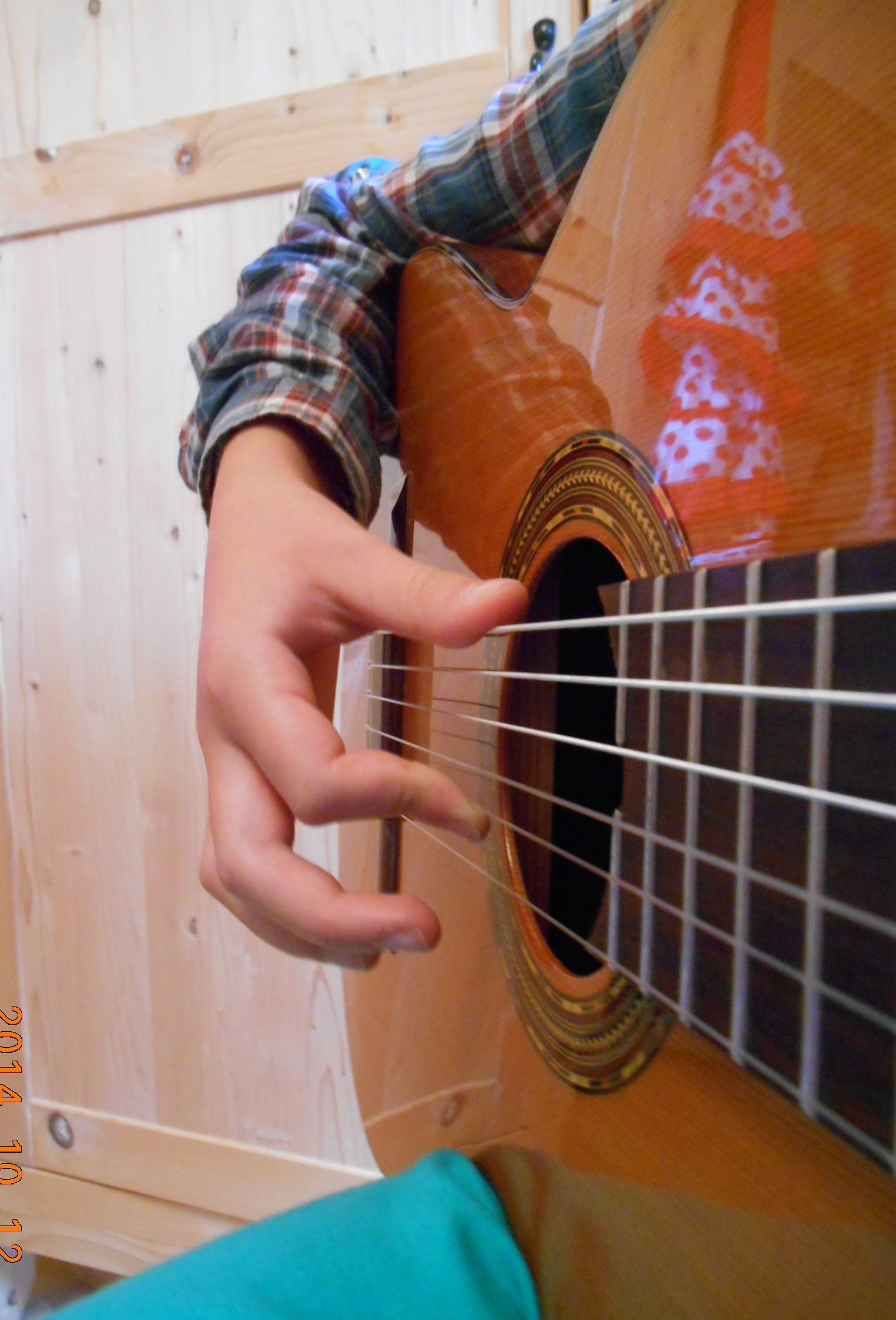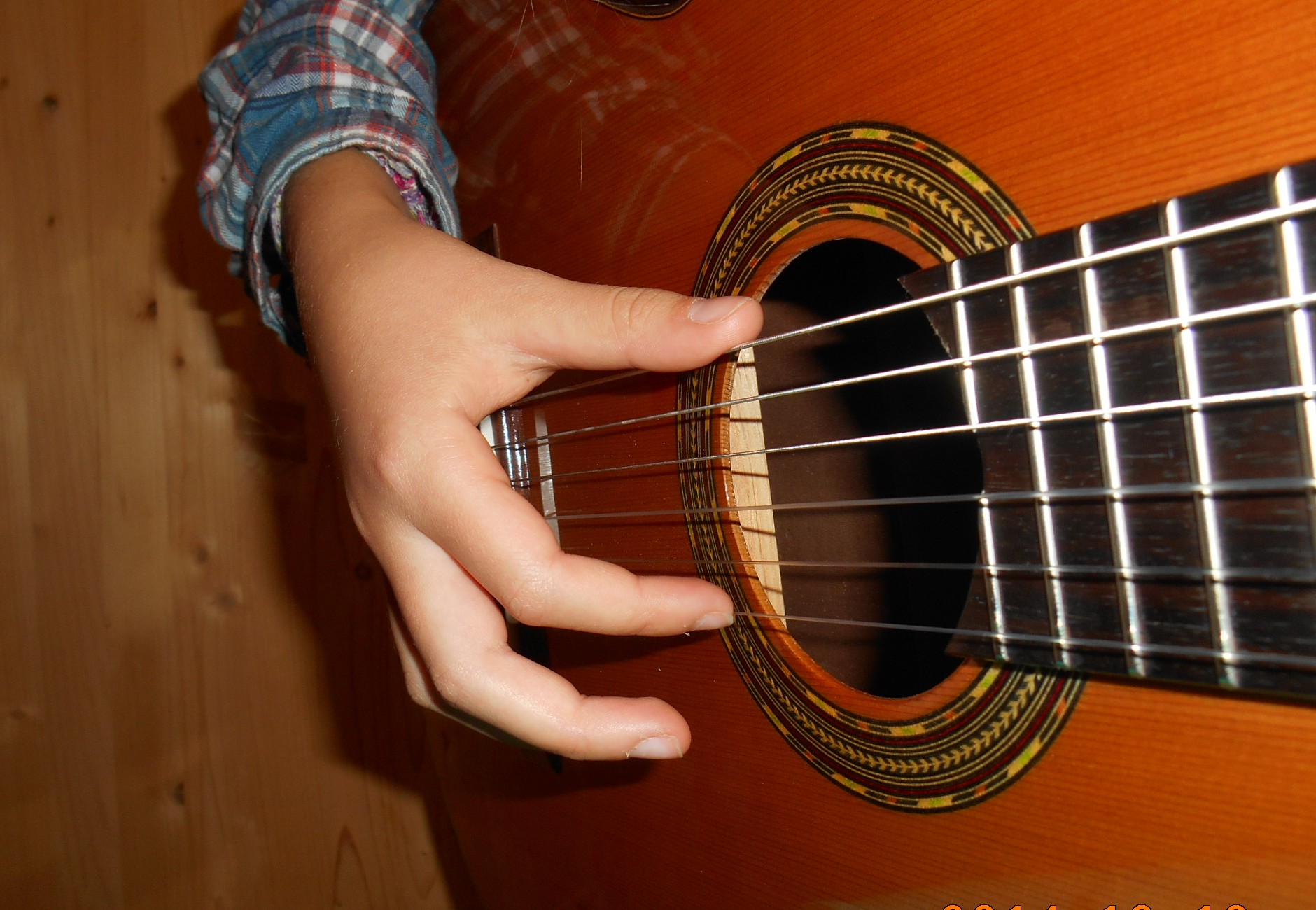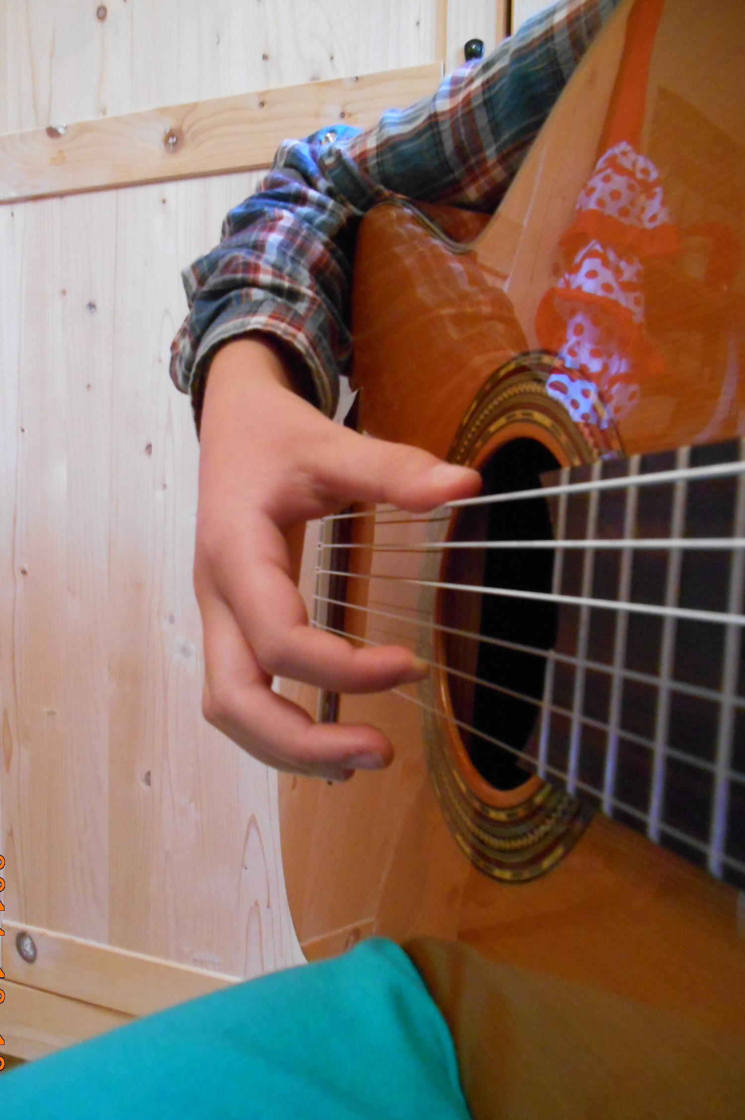 Je donne tout de même mon exercice que j’ai appelé « exercice de fixation » et qui ressemble fortement à celui sur le dos de la guitare : les doigts de la main droite sont placés sur les quatre premières cordes (a sur 1, m sur 2,…) et chaque doigts doit jouer en appui, plusieurs fois. Cela entraîne toujours une bonne position de main droite et un mouvement correct de chaque doigt, en relâchant inévitablement la dernière phalange.