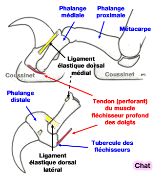 Chez d’autres espèces, les félins notamment (à l’exception du guépard), le fléchisseur profond permet de faire sortir les griffes. Un astucieux système de tendon traversant rend celles-ci mobilisables par le FCP. Ce muscle, permettant la préhension et l’immobilisation des proies, actionne ainsi des griffes qui sont de véritables armes indispensables à la prédation et donc la survie de l’espèce.