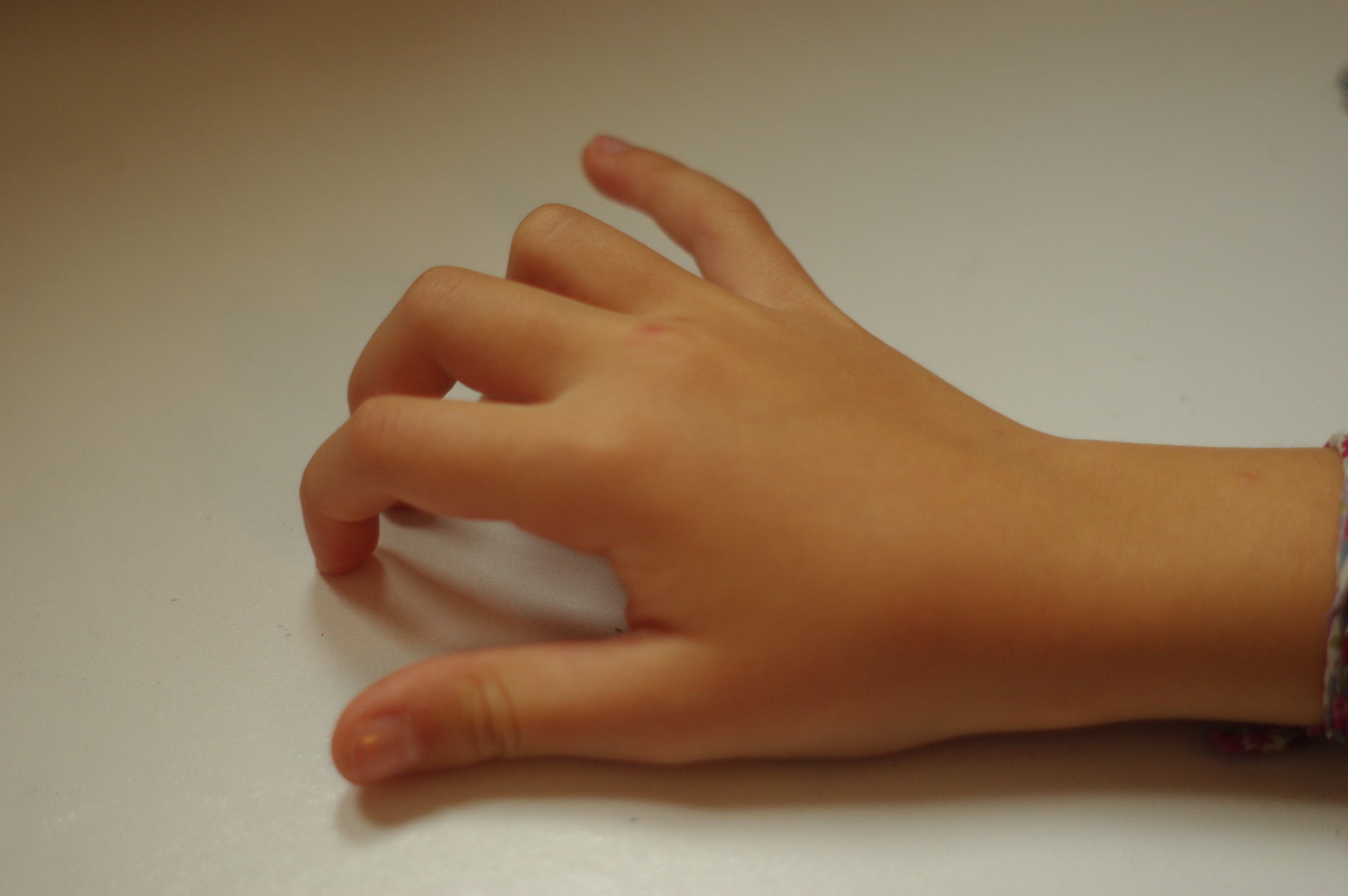 Travail préparatoire sans l’instrument. L’élève pose sa main sur une table ou sur la guitare retournée. Les doigts reposent passivement, hormis l’auriculaire levé afin de mobiliser la partie cubitale et donner une structure plus tonique à la main.