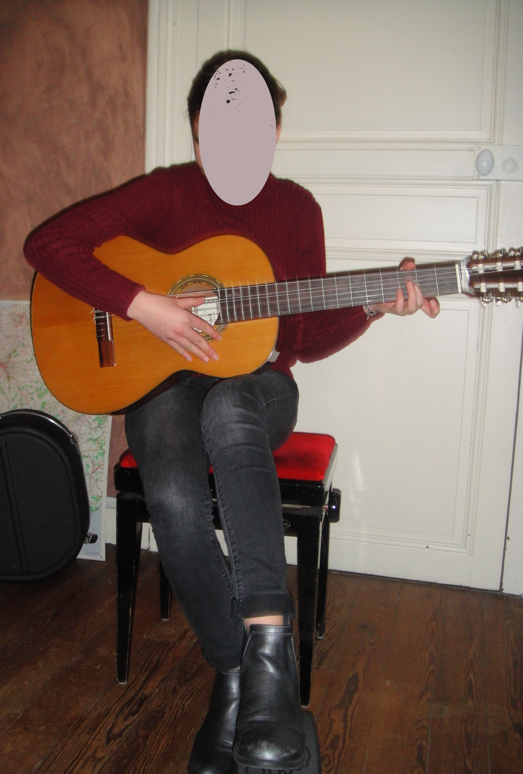 Ici, l’élève débutante, à qui aucune consigne n’a été donnée, se saisit de la guitare spontanément. Ses mains lui servent à maintenir la guitare en place, ce qui correspond à leur fonction naturelle, mais l’empêchent de jouer.
